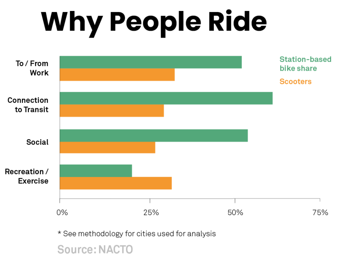 A apresentação mostra um quadro curioso. As bicicletas a pedal e na estação são as preferidas para quem vai de bicicleta ao trabalho, para se conectar ao trânsito e fazer a social com amigos. Os patinetes ganham nos quesitos recreação e exercícios.