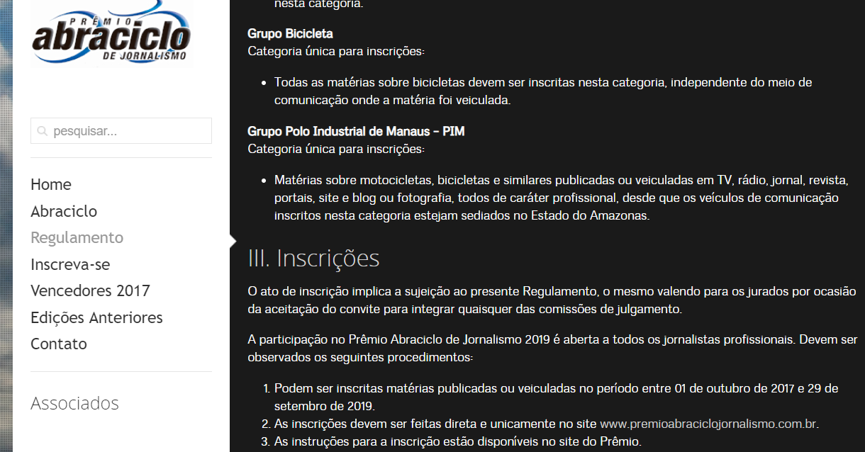 O Prêmio Abraciclo premia com 8 mil reais reportagens que contribuam para a expansão do uso da bicicleta. Esse valor é para a primeira colocada. As segunda e terceira recebem 3,5 mil e 2,5 mil, respectivamente. Vale qualquer mídia. O prazo de inscrição é até 30 de setembro e valem matérias produzidas de 1º outubro de 2017 a 29 de setembro de 2019, ou seja, ainda dá para entrevistar, escrever, filmar, gravar ou fotografar. E publicar.