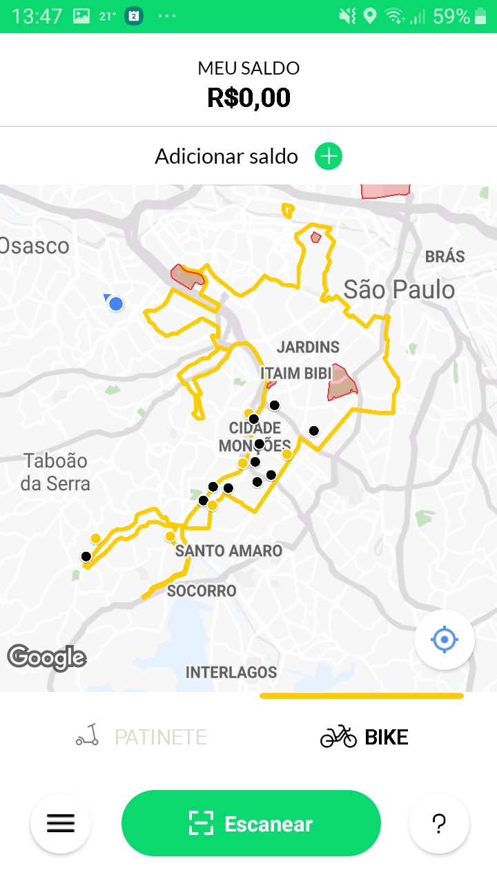 Nas imagens abaixo, é possível comparar onde o serviço estava disponível em maio de 2018 e hoje, com o novo dimensionamento. A linha amarela mostra onde é permitido estacionar as bicicletas.