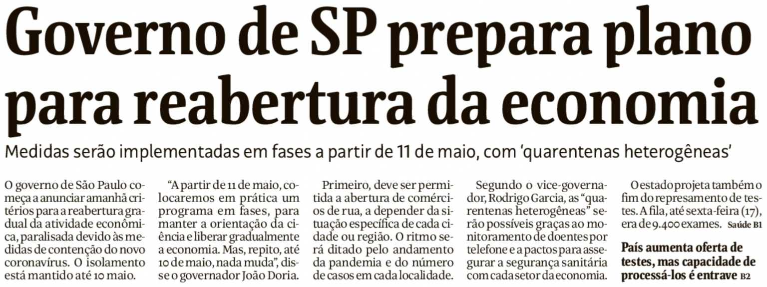 O vice-governador de São Paulo, Rodrigo Garcia, disse ontem que a partir de 11 de maio o governo paulista poderá implementar uma “quarentena heterogênea” para permitir a reabertura da economia no estado. Hoje, a Folha de S.Paulo deu manchete sobre o assunto.