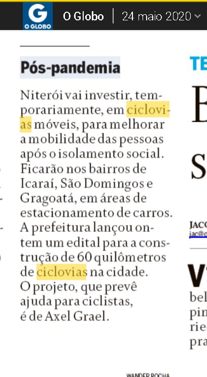 Além de Curitiba, talvez Niterói anuncie algum programa. O secretario de planejamento da cidade, Alex Grael foi citado em nota publicada pela colunista Ana Claudia Guimarães de O Globo na edição de 24/05. Ele teria dito que anunciaria a criação de ciclovias temporárias em alguns bairros da cidade, como Icaraí, São Domingos e Gragoatá.