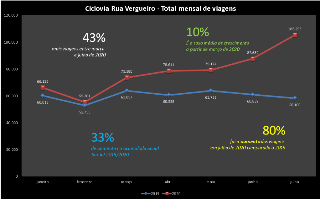 Em comparação com julho de 2019, houve um aumento de 80% no número total de viagens e, desde março deste ano, o crescimento foi de 43%. É um avanço médio mensal de 10% desde que foi decretado o estado de calamidade da cidade de São Paulo, em 23 de março. Já no acumulado do primeiro semestre, a alta é de 33% em relação ao mesmo período de 2019. A ciclovia da Vergueiro Liga o centro da Cidade à região da Vila Mariana e conecta-se à ciclovia da avenida Paulista.