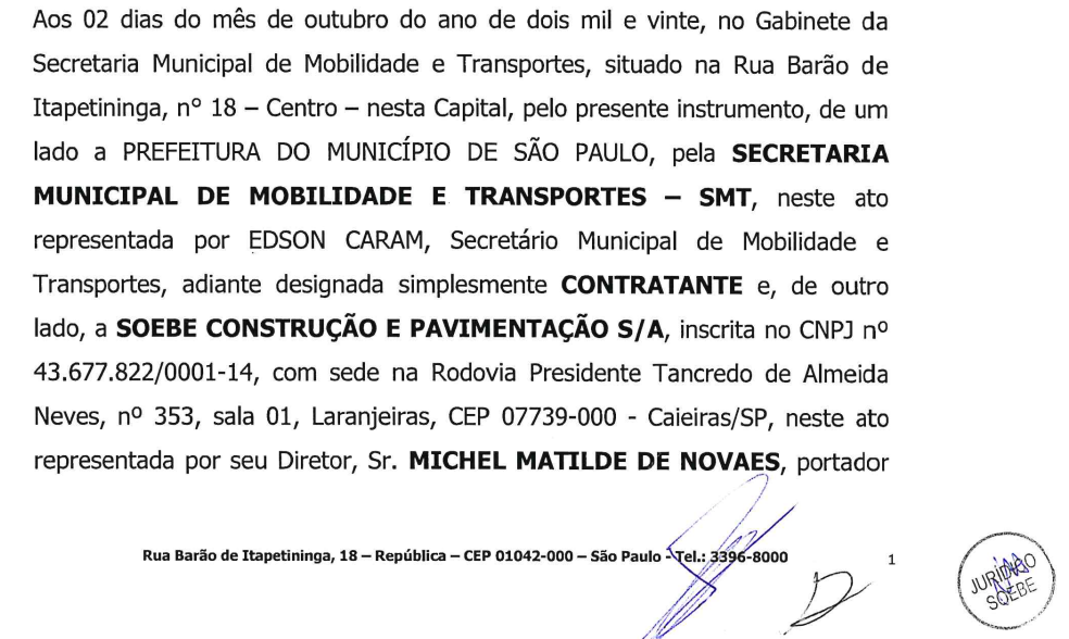 No documento, todavia, há um erro que passou despercebido. É o nome de Edson Caram, ex-secretário de Mobilidade, que figura como representante da SMT e não o de Elisabete França, a atual secretária. É ela quem de fato assina o papel junto com outras quatro pessoas: os representantes da Soebe Engenharia, Michel Matilde de Novaes e Fernando Rodrigues de Souza e as duas testemunhas, Letícia Alves Assumpção e Diogo do Nascimento Leal. No papel, há também um carimbo redondo com a inscrição “Jurídico Soebe”