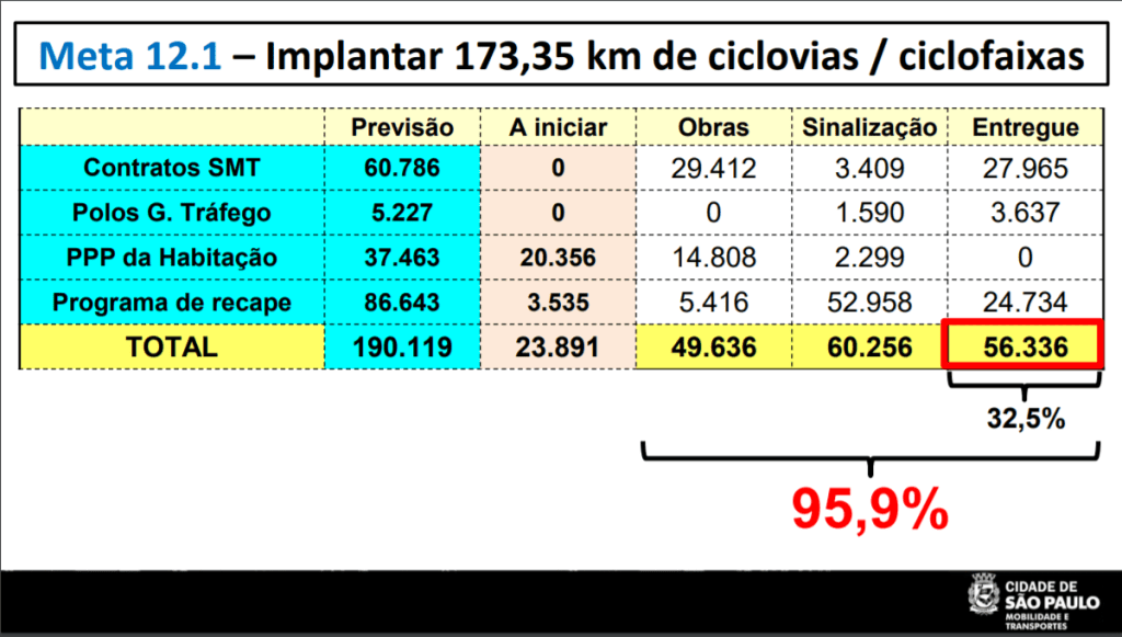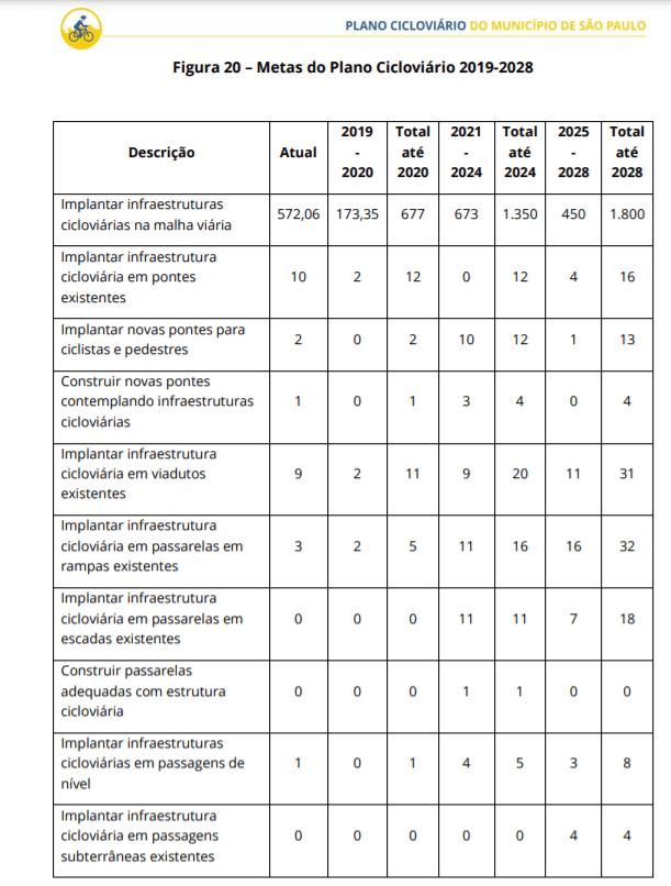A Secretaria Municipal de Mobilidade apresentou na última reunião da Câmara Temática da Bicicleta (CTB) o status do Plano Cicloviário da Capital previsto para 2020. Até o di a 3 de dezembro, a gestão Dória/Covas havia entregado 53,34 quilômetros de nova infraestrutura e 60,26 quilômetros estavam em fase de sinalização. A apresentação ainda mostra que 49,64 quilômetros estavam obras, totalizando 166,23 quilômetros ou 96% da meta prevista de 173,53 quilômetros prometidos para 2020. No mesmo quadro, a SMT também informou que outros 23,89 quilômetros estavam para ser iniciados ainda neste mês.