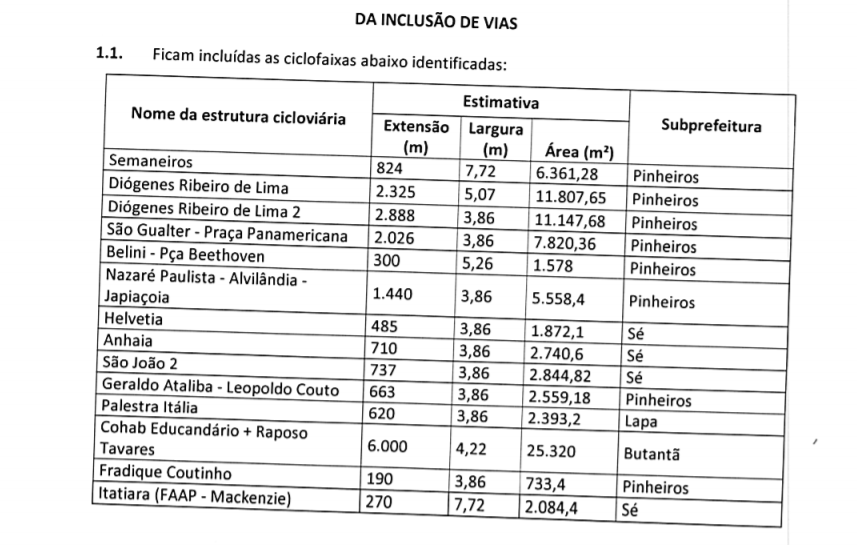 Um desses aditivos foi publicado alguns dias atrás e prevê 19 quilômetros de novas ciclofaixas em locais ainda não prioritarios, como na avenidas Diógenes de Lima, São Gualter e Nazaré Paulista, no Alto de Pinheiros. Nesse mesmo bairro, uma curiosidade: o quadro anexo ao contrato mostra larguras de ciclofaixas incompativeis com as apresentadas na cidade quje em geral, não passam de quatro metros quando são bidirecionais (mão dupla). Na rua dos Semaneiros, que ligará a Praça do Por do Sol até a estação CPTM Cidade Universitária , a largura prevista da estrutura é de 7,72 metros. Foi pedida uma explicação para assessoria de imprensa da SMT sobre quais critérios usaram para definir a largura da ciclofaixa mas o setor não enviou qualquer resposta.