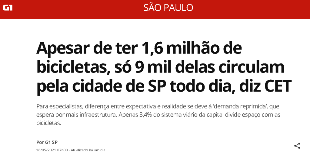O portal de notícias G1 publicou notícia em que afirma existirem só 9 mil bicicletas em circulação diária na Capital. Para isso, usaram apenas os números de contadores de ciclistas localizados nas ciclovias da rua Vergueiro e avenidas Gastão Vidigal e Brigadeiro Faria Lima.