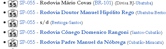 Vale destacar que as identificações numéricas das rodovias referem-se em muitos casos a múltiplas denominações. A SP 055, por exemplo, é o mesmo número das rodovias Mario Covas (antiga BR 101), Doutor Manuel Hipólito do Rego, Cônego Domenico Rangoni e Padre Manuel da Nóbrega, que integram a faixa litorânea do litoral paulista que liga Ubatuba no Litoral Norte a Peruíbe no Litoral Sul, se estendendo até Pedro de Toledo, no Vale do Ribeira.