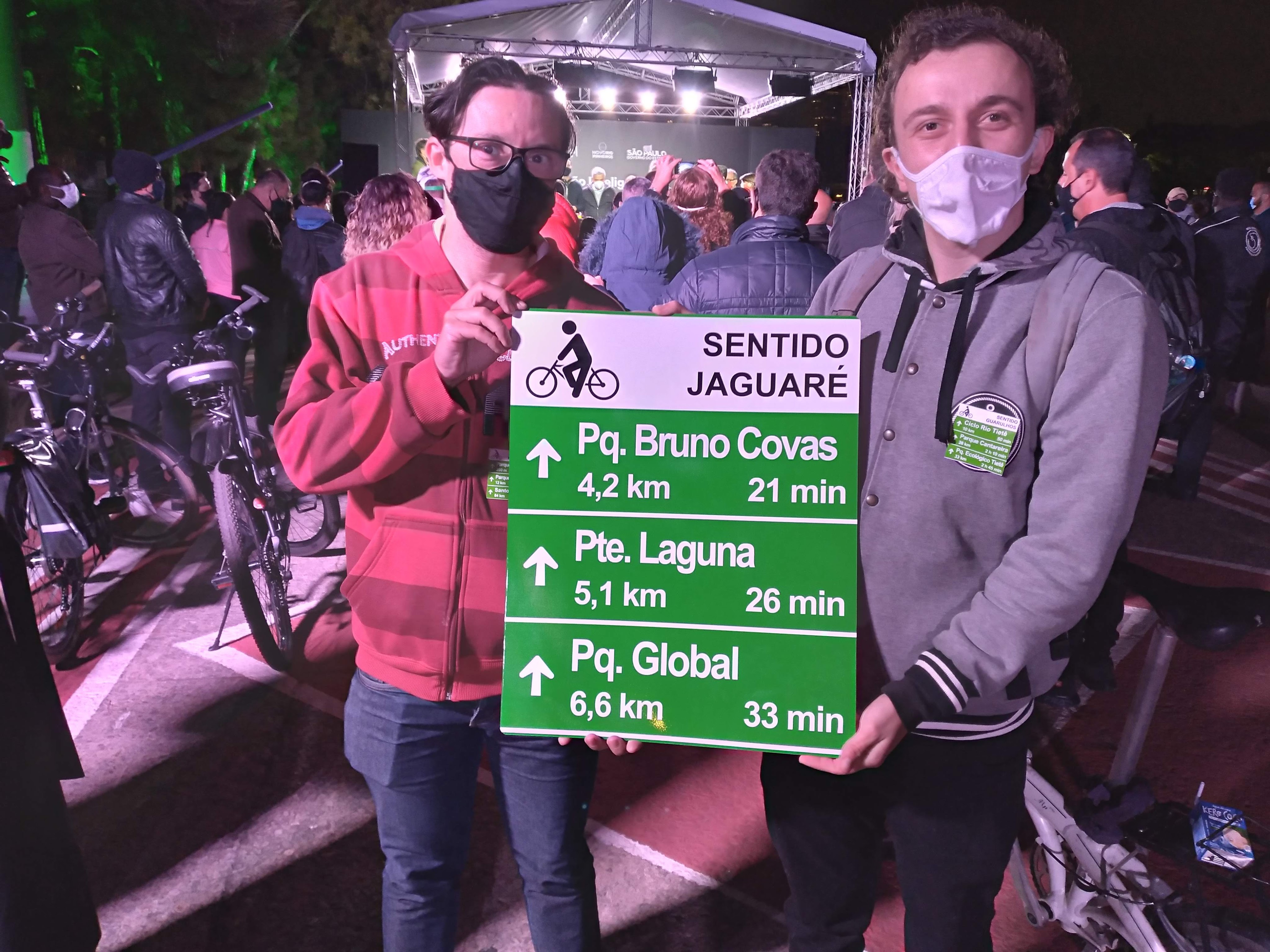Durante as cerimônia, também foi anunciada que a Farah Services, empresa que assumiu a administração da ciclovia margem leste, está financiando a instalação de 360 placas de sinalização de distância e tempo de percurso entre pontos usados por ciclistas nas margens leste e oeste do Rio Pinheiros. Paulo Alves, do coletivo Bike Zona Sul e Felipe Claros, do coletivo Bike Zona leste, apresentaram para o governador um protótipo das placas, que possuem o padrão usado pela Prefeitura de São Paulo.