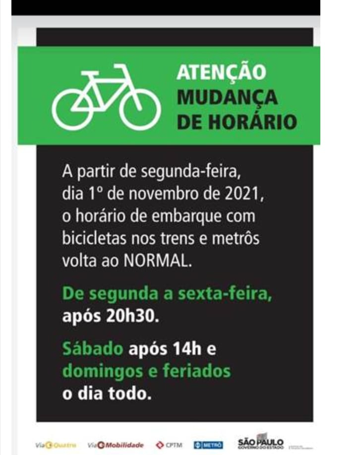 A Secretaria de Transportes Metropolitanos do governador João Dória (PSDB), por meio da coordenadora de comunicação, Thais Antonelli, negou ter autorizado qualquer ação oficial de comunicação para funcionários ou usuários de trens da CPTM, Metrô, Via Mobilidade e Via Quatro sobre a revogação, a partir de 1º de novembro, do horário especial para transporte de bicicletas que está em vigor desde 25 de junho de 2020 e permite que ciclistas acessem vagões das 10 às 16 horas de segunda à sexta-feira e durante todo o sábado.