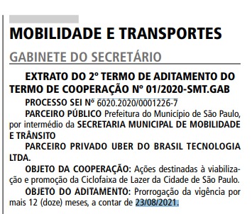 A Uber informou à prefeitura de São Paulo que não vai renovar o termo de cooperação para continuar patrocinando a Ciclofaixa de Lazer. Com isso, a população pode ficar sem essa opção de lazer por semanas, ou até meses, segundo um servidor da secretaria de Mobilidade e Trânsito, pois a cidade ainda não tem um substituto.