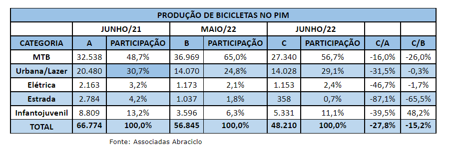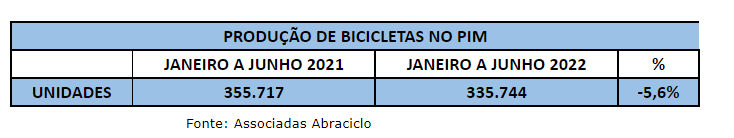 A entidade que reúne as montadoras de bicicletas do Polo Industrial de Manaus divulgou semana passada o balanço semestral e reviu para baixo a expectativa de produção anual. Com isso, o número de 880 mil bicicletas esperado para este ano vai ser reduzido para 750 mil unidades, quase o mesmo que em 2021 , quando o polo industrial produziu 749.320 bicicletas.
