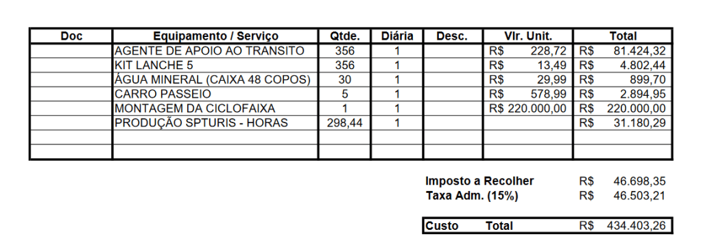 A montagem da Ciclofaixa de Lazer de por esse contrato emergencial tem valores muito superiores aos R$ 220 mil por dia informados pelas duas últimas prestadoras desse serviço, a Uber e a Agência Coranda, que arcavam os custos operacionais da ciclofaixa para inserir suas marcas no material de sinalização.