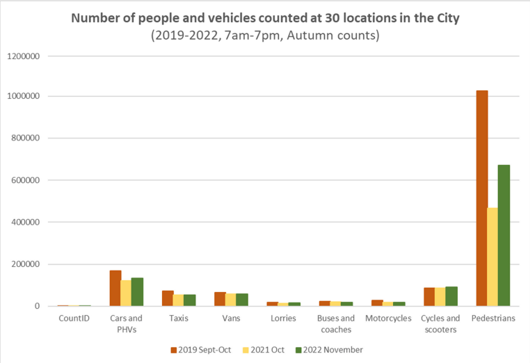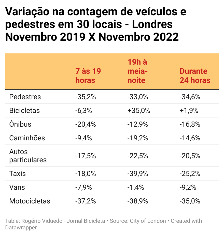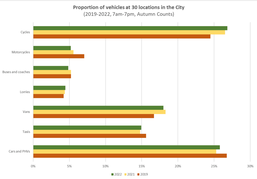A última contagem de veículos realizada em 30 locais da City de Londres (centro financeiro da Capital da Inglaterra) aconteceu em 23 novembro de 2022, em condições climáticas de chuva e vento e mostra que bicicletas e patinetes (ciclos) são 40% do tráfego individual rodoviário nos horários de pico da manhã e da noite e respondem por 27% do total de veículos contados entre 7 da manhã e 7 da noite (quadro 1).