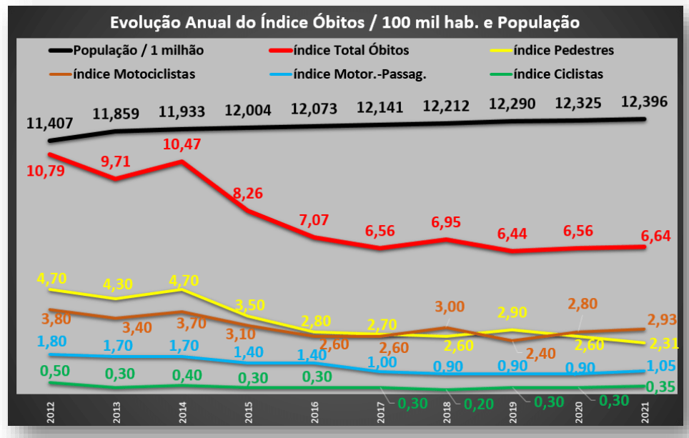Com isso, as mortes e o índice voltaram a subir. No último relatório da CET, de 2021, já está no patamar de 6,64 mortes por 100 mil habitantes, referente à 797 óbitos. Em 2022, ainda que não tenham sido analisados pela CET, a Plataforma Infosiga, do governo estadual, mostra que a cidade registrou 904 óbitos de trânsito, o que daria um índice de 7,3 óbitos por 100 mil habitantes.