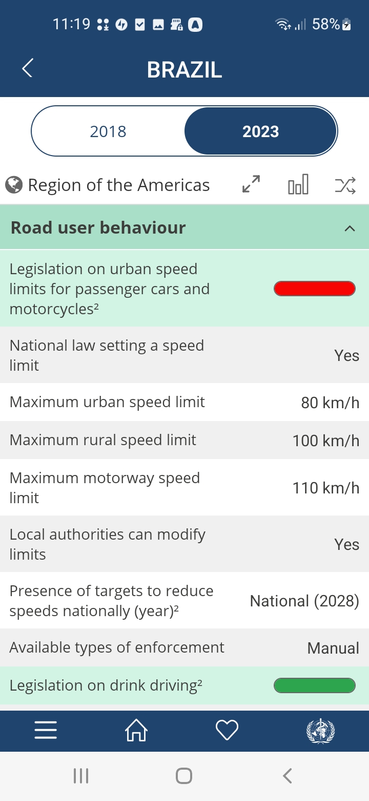 Há outros avanços na exibição nos dados do Brasil. Em 2021, já estava informada a meta para redução de fatalidades viárias em 50% até 2028 (relativo ao total de 2016). Por outro lado, há um alerta para a falta de legislação que limite a velocidade urbana em 50 quilômetros por hora dentro das cidades.