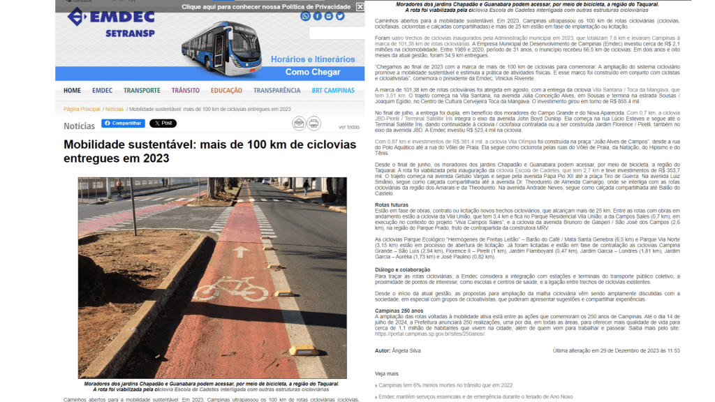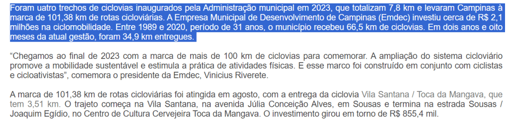 “Foram uatro (sic) trechos de ciclovias inaugurados pela Administração Municipal em 2023, que totalizam 7,8 km e levaram Campinas à marca de 101,38 km de rotas cicloviárias”.