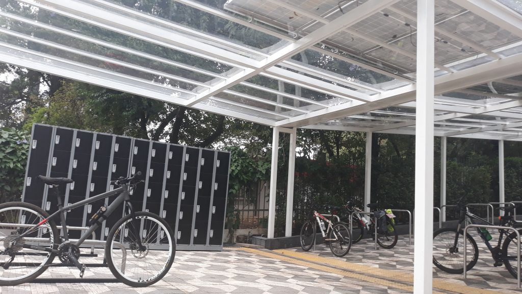 O desenho moderno do espaço coberto por telhas translúcidas e piso antiderrapante acolhe 80 bicicletas normais, quatro cargueiras, possui bancos de apoio, armários para guardar pertences, banheiros acessíveis, estações de ferramentas e tomadas para carregar patinete ou bicicleta elétrica, cuja energia é gerada por placas solares.
