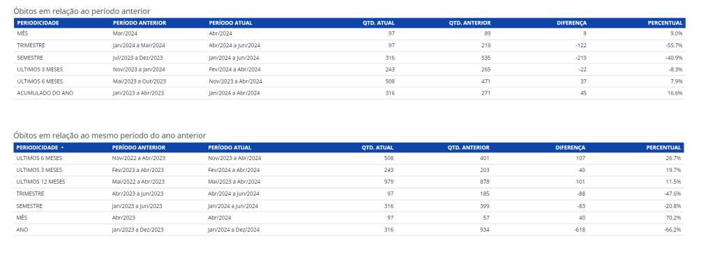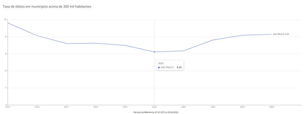 De acordo com o painel, em um ano, seja na comparação abril/abril seja no acumulado de janeiro a abril (2023/2024) os casos de óbitos subiram à taxas alarmantes no Estado de São Paulo. E são ainda mais preocupantes na Cidade de São Paulo.