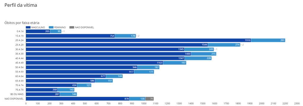 A nova versão do Infosiga também permite enxergar com clareza quem são as principais vítimas do trânsito no estado. Em qualquer período, os jovens de 18 a 24 anos lideram com folga. Aqui, selecionei de Janeiro de 2021 a abril de 2024.