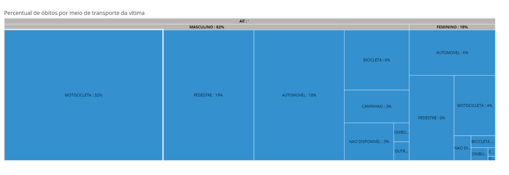 Outro bom recurso é o destaque por tipo de veículo. Em todo o estado, os motociclistas lideram os óbitos, com 32% dos casos, seguidos por pedestres, com 19%. Ciclistas, são 6%.