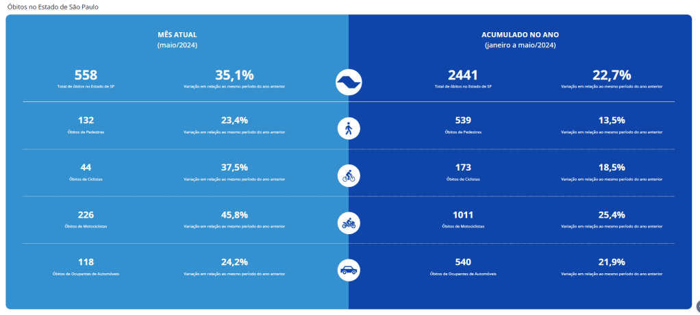 As altas nas mortes de trânsito também subiram forte no Estado de São Paulo. No geral foram 558 óbitos em maio, alta de 35,1% e 2.441 casos no acumulado do ano, alta de 22,7%.