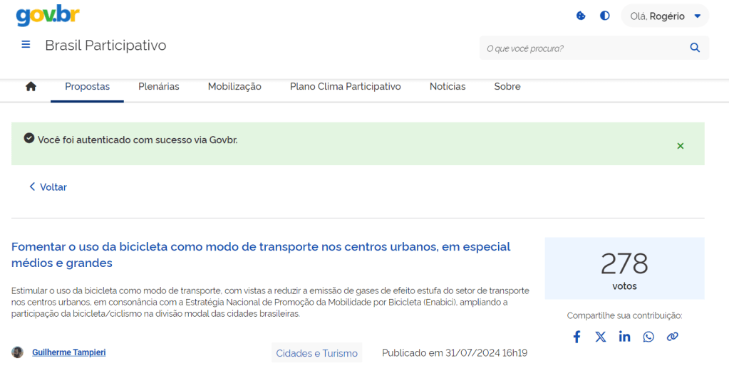 Com esse apoio, é possível sonhar com uma inclusão do uso da bicicleta no Plano Clima como ferramenta de mitigação da emissões de gases que provocam o efeito estufa. Numa consulta pública relativa ao tema, a proposta criada por Guilherme Tampieri, de Belo Horizonte (MG), de fomentar uso de bicicletas nas cidades, em especial nas médias e grandes, recebeu 278 votos na plataforma Brasil Participativo.