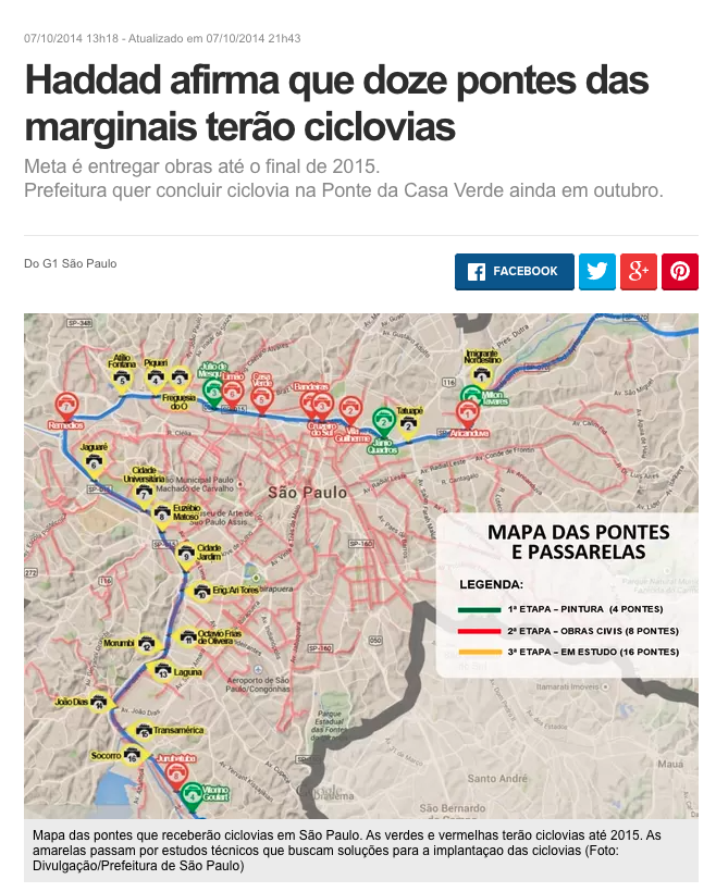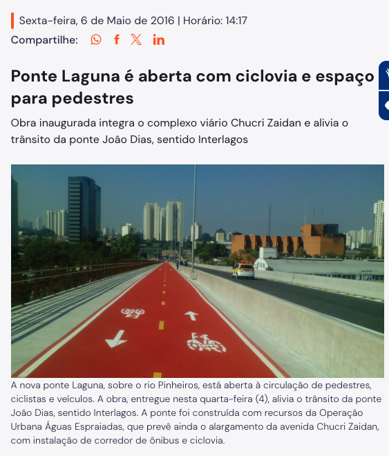 Durante a gestão de Fernando Haddad, 12 pontes ganharam o espaço para o ciclista, incluindo a Ponte Laguna, na Zona Sul, a primeira que teve uma espaçosa ciclovia incluída já em sua construção.