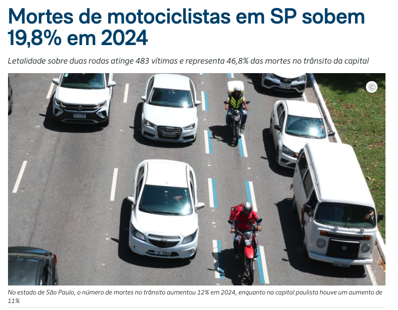 A segunda gestão de Ricardo Nunes começa com o tema da segurança viária em xeque. O ano de 2024 registrou um aumento recorde de mortes de trânsito, ultrapassando os mil óbitos pela primeira vez desde 2015, marca que tinha sido superada na gestão de Fernando Haddad através de medidas de acalmamento de tráfego. O último ano também registrou aumento histórico de mortes de ciclistas.