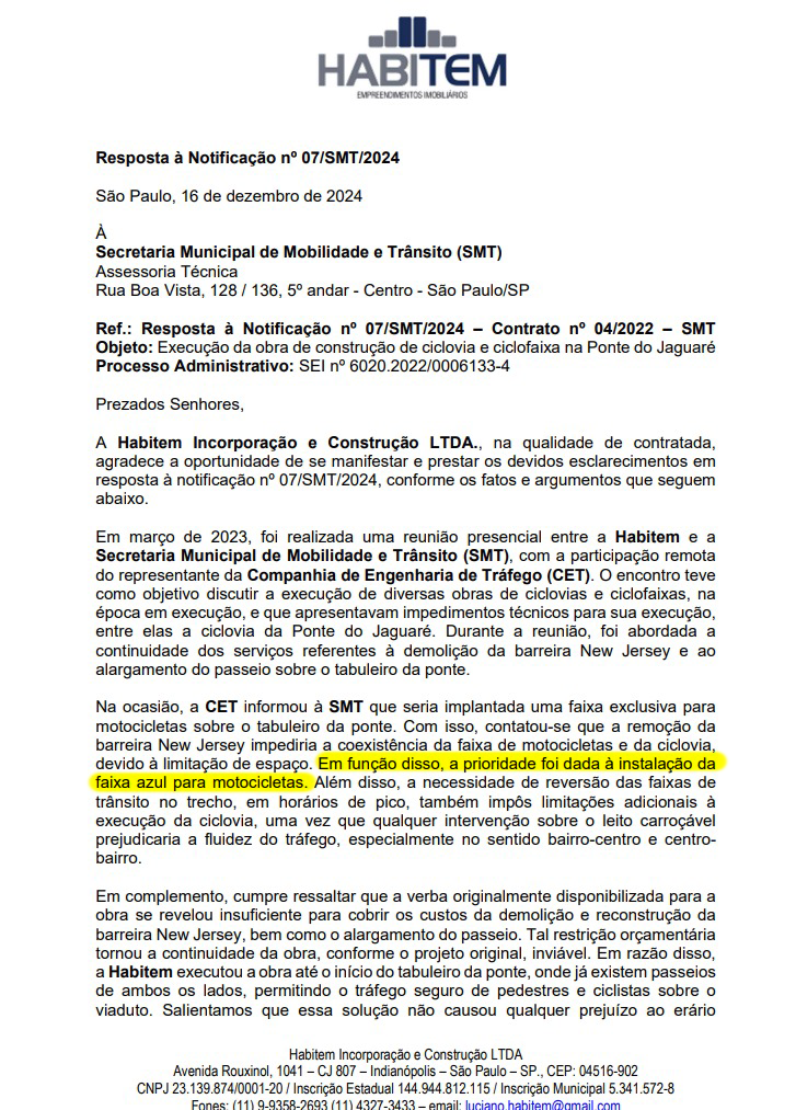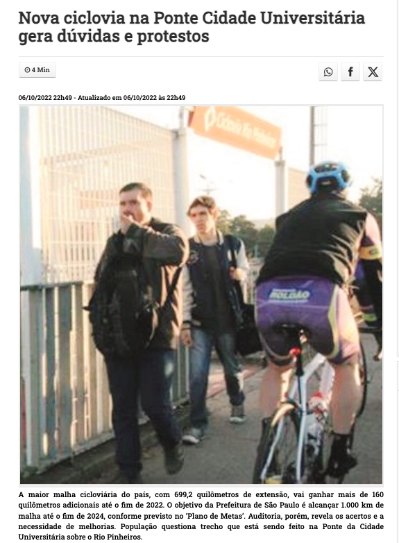 O caso da Ponte do Jaguaré é grave. A transposição chegou a ser incluída em uma licitação de expansão da rede cicloviária em 2022, mas a prefeitura mudou de ideia, impedindo que a obra fosse finalizada para reservar o espaço dos ciclistas para uma futura Faixa Azul de Motocicletas.