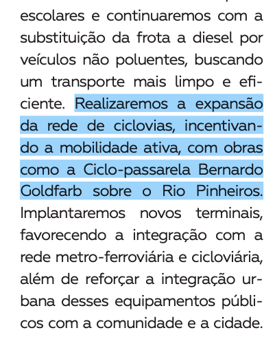 Os prefeitos que sucederam Haddad no cargo optaram por descontinuar a política de valorização da mobilidade ativa, com mínima ampliação da rede cicloviária. Somente em 2023 foi finalizada a ciclovia da Ponte Cidade Universitária, sob protestos de Associações de Moradores do Alto de Pinheiros.