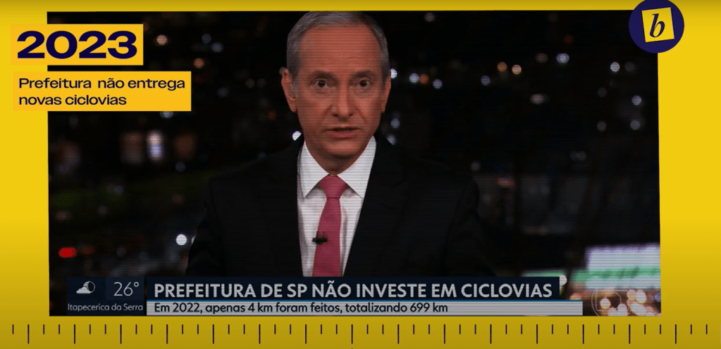 Ele encadeou e intercalou uma sequência de reportagens e relatos de ativistas que contam como a promessa de fazer 300 km de novas estruturas prometidas pelo antecessor, Bruno Covas, de quem Nunes herdou a cadeira. A meta foi sendo esquecida ao longo dos quatro anos e ele só entregou 15% do total.